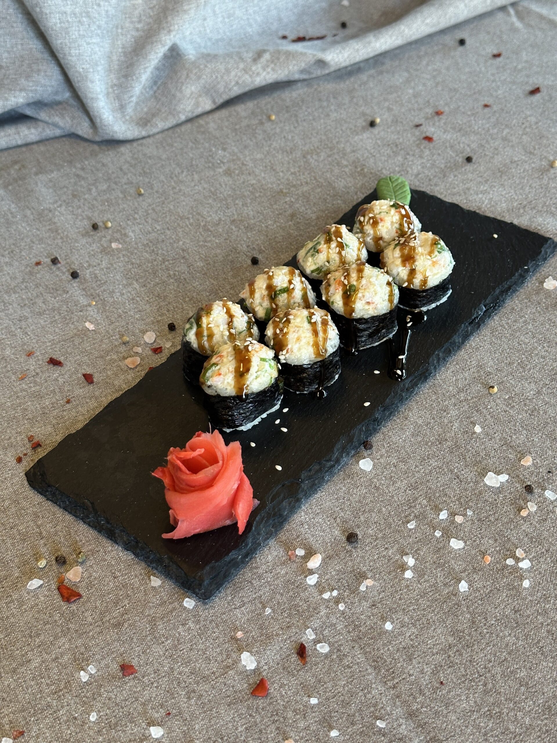 Теплые роллы с тигровой креветкой, сливочным сыром и соусом терияки.