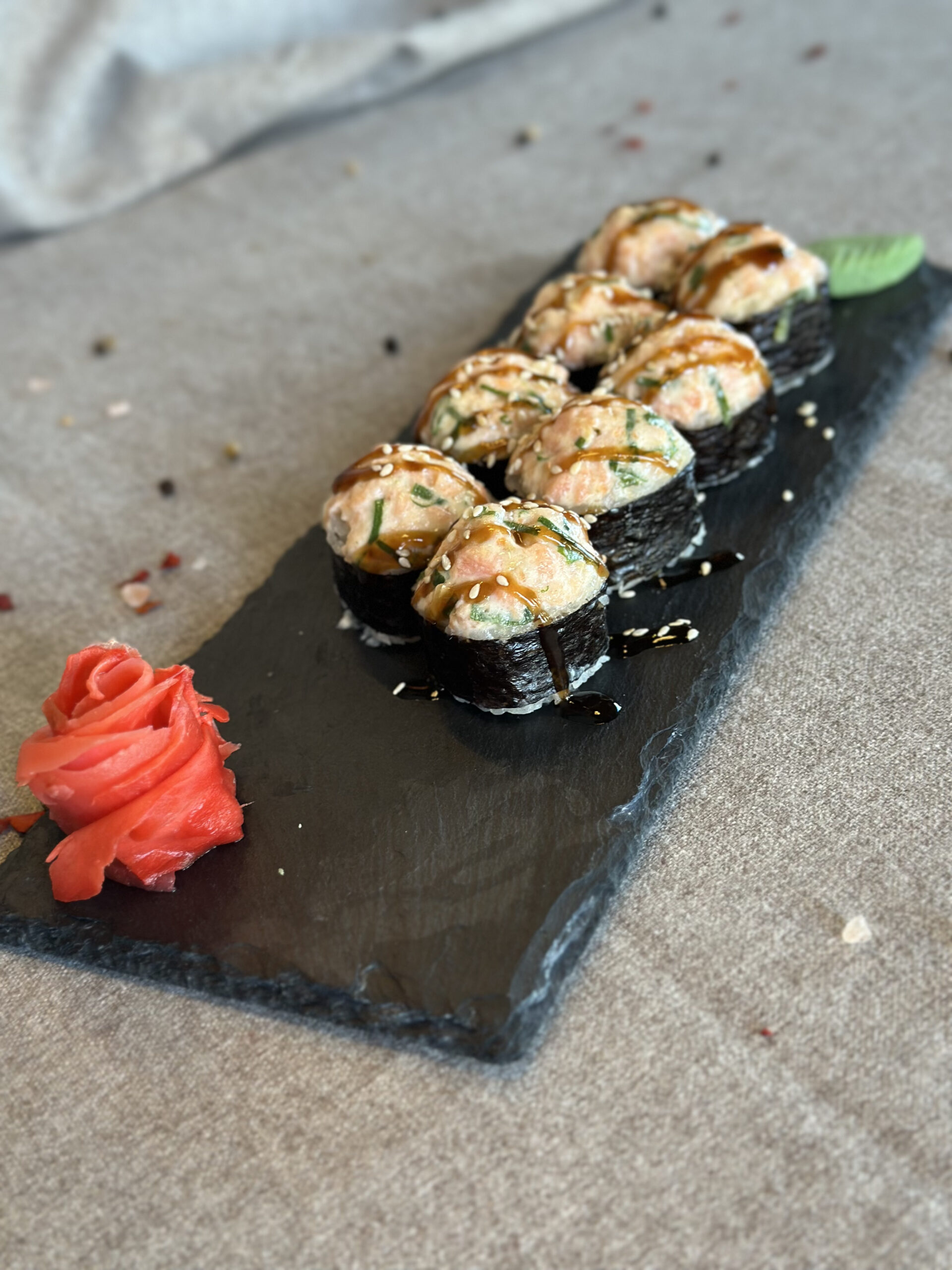 Теплые роллы с лососем, сливочным сыром и соусом терияки.