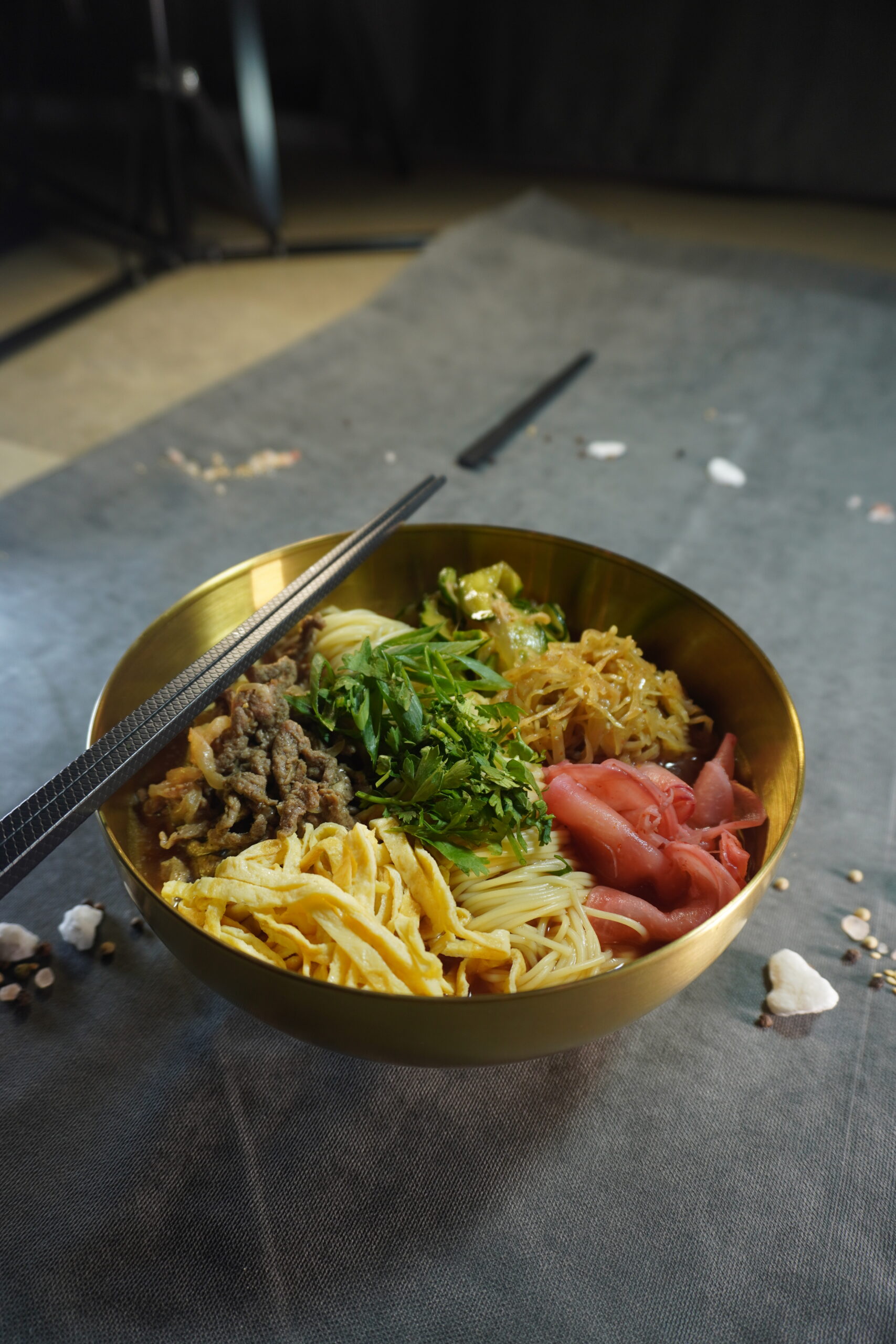 Суп на томатной основе, подается холодным или горячим, с тонкой пшеничной лапшой, жареной говядиной или курицей, омлетом, капустой, огурцами и ароматными специями.