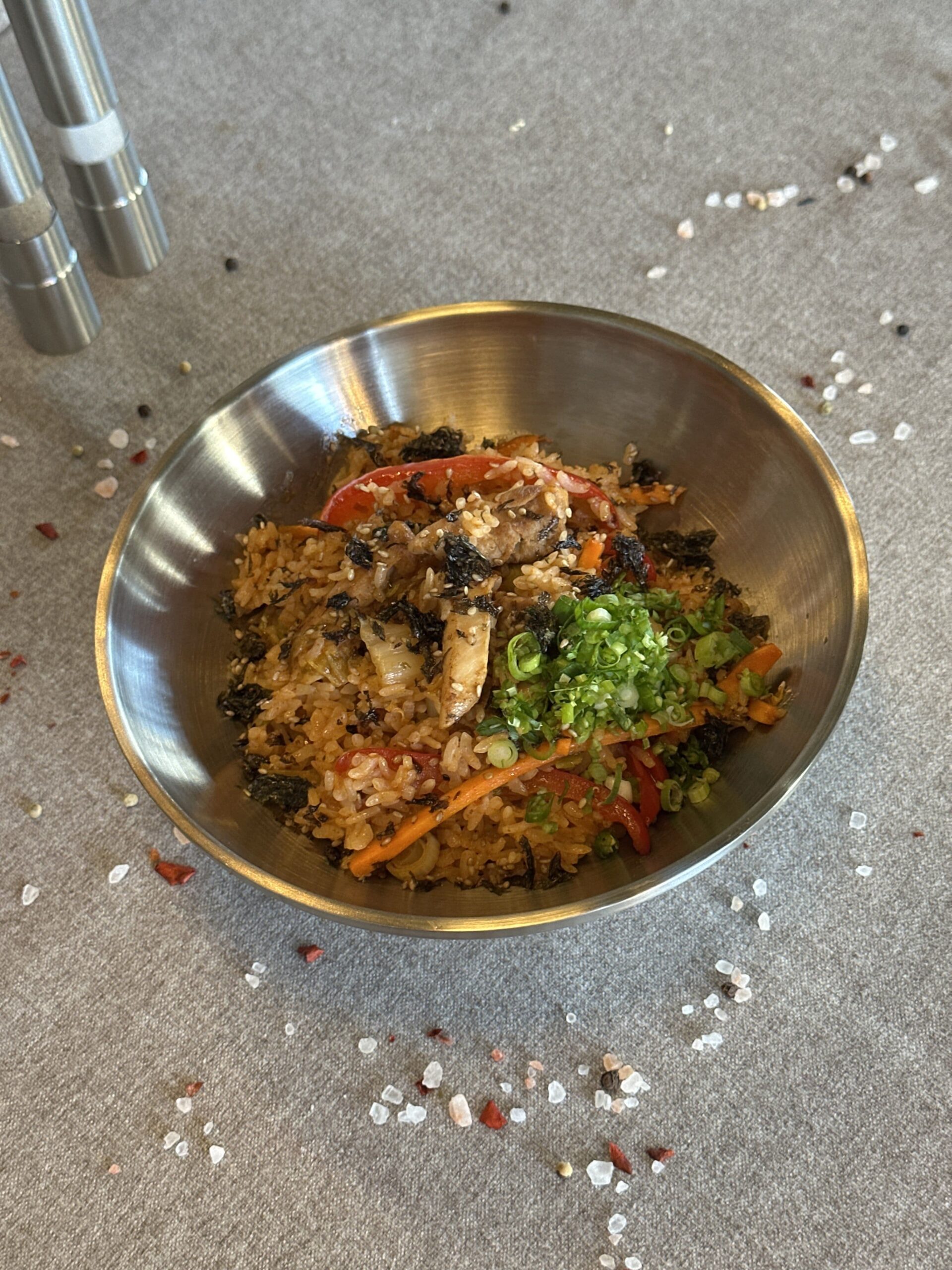 Ароматное и сытное блюдо из нежного маринованного куриного бедра, тушеного с овощами и пикантной пастой кочудян и ким-чи, подается с отварным рисом, посыпанное кунжутом и украшенное кинзой.