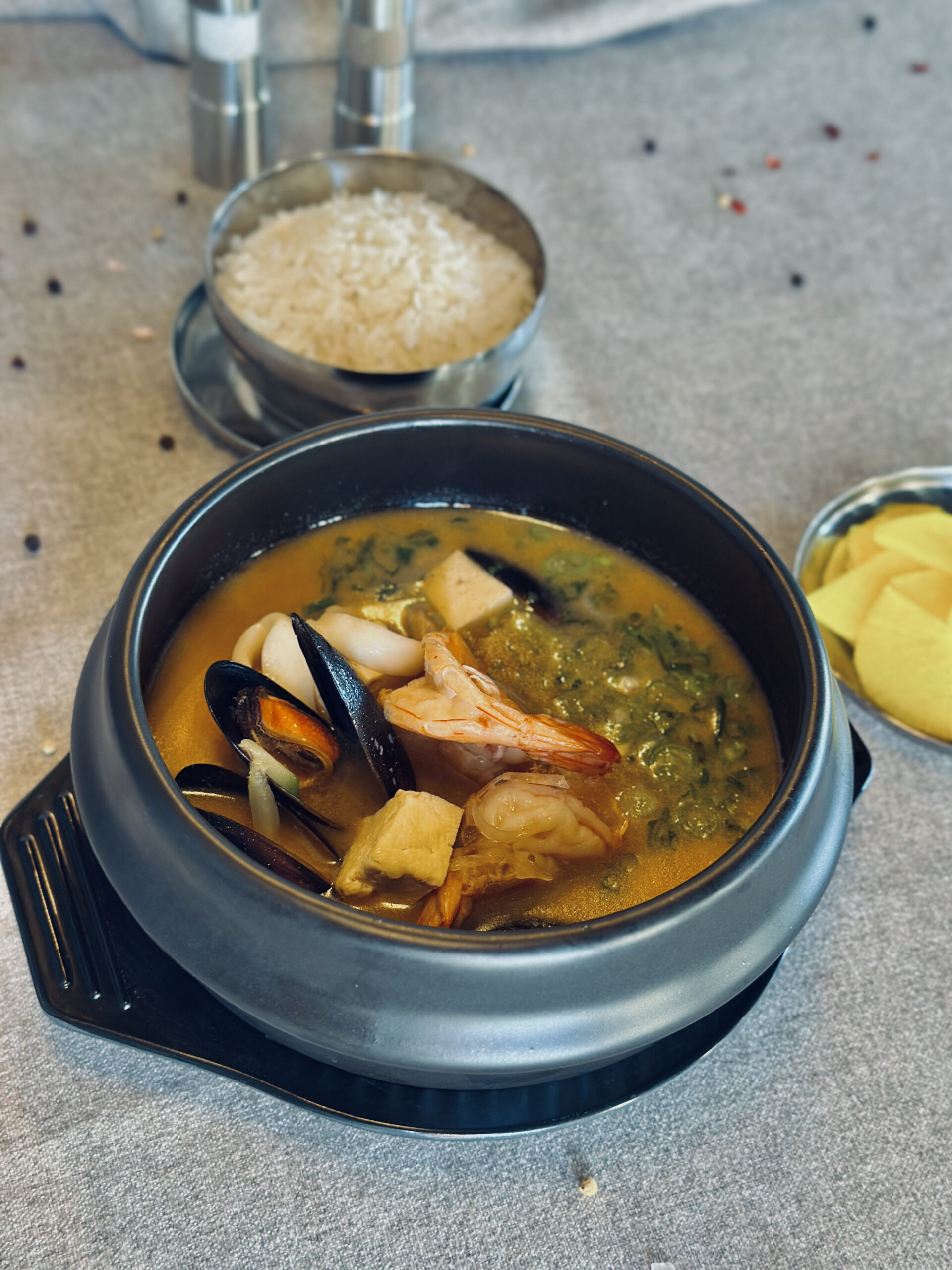 Насыщенный корейский суп на основе ароматной пасты тендян, нежными морепродуктами (кальмар, креветки, мидии), овощами и тофу, приправленный свежей зеленью. Подается с рисом и маринованным дайконом.