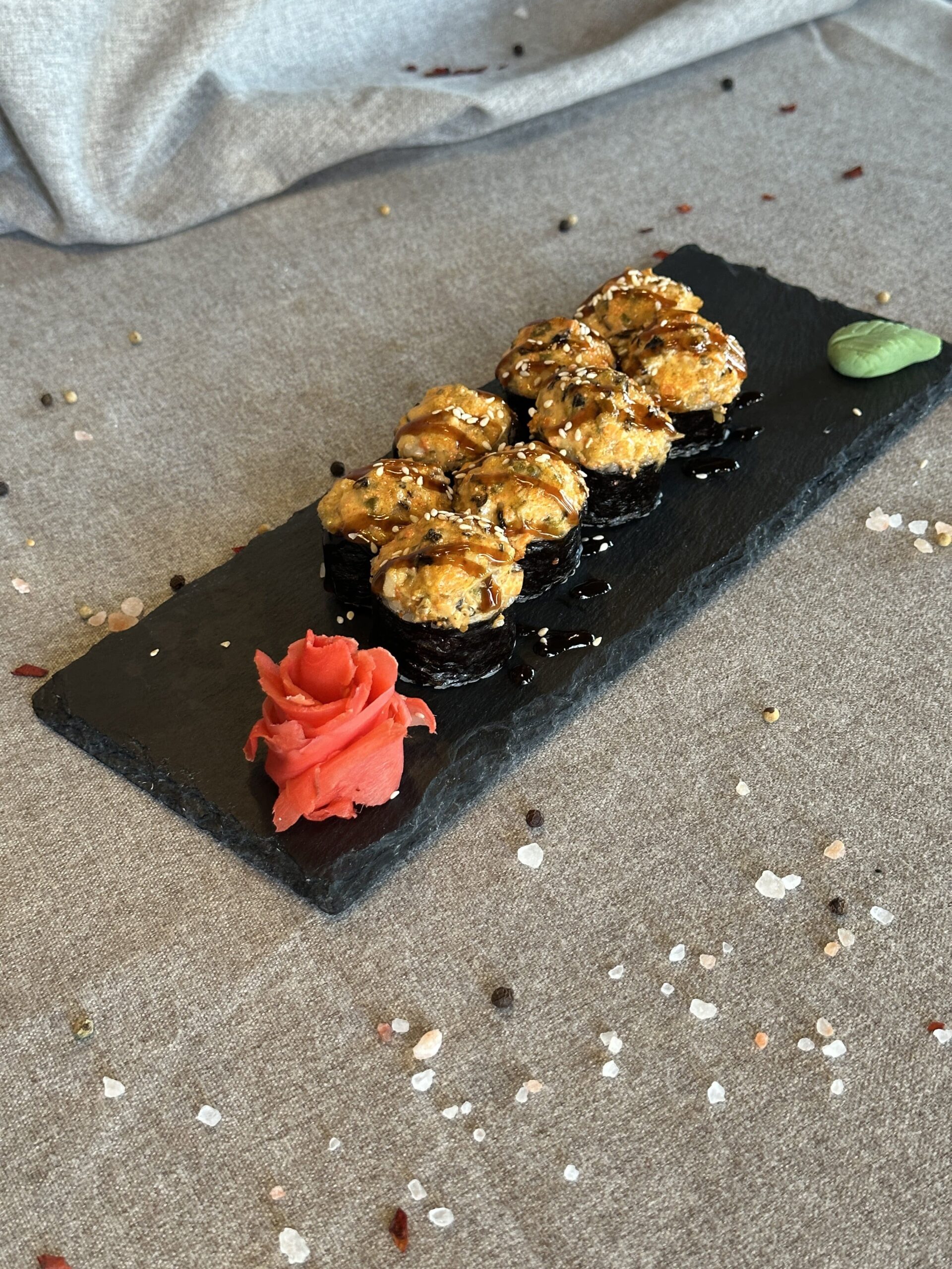 Сочетание лосося, творожного сыра, листа салата. Запеченный с мидиями и пикантного спайси соуса.
